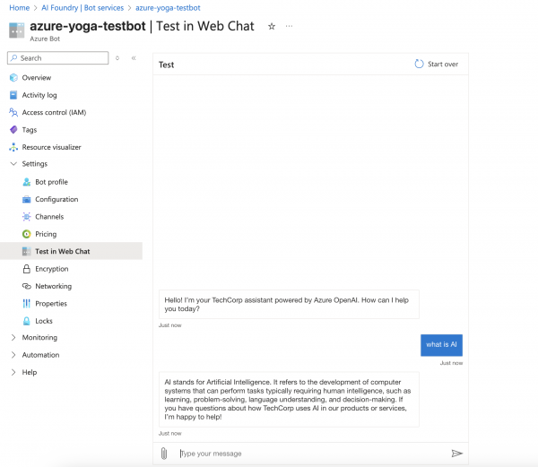 1. Azure Open AI service - Obtain the key, endpoint and the deployment name. 2. Create a new Azure bot from the bot service with multi tenant ( single tenant does not work but multi tenant is out of support after july end. Have to investigate what could be the workaround)