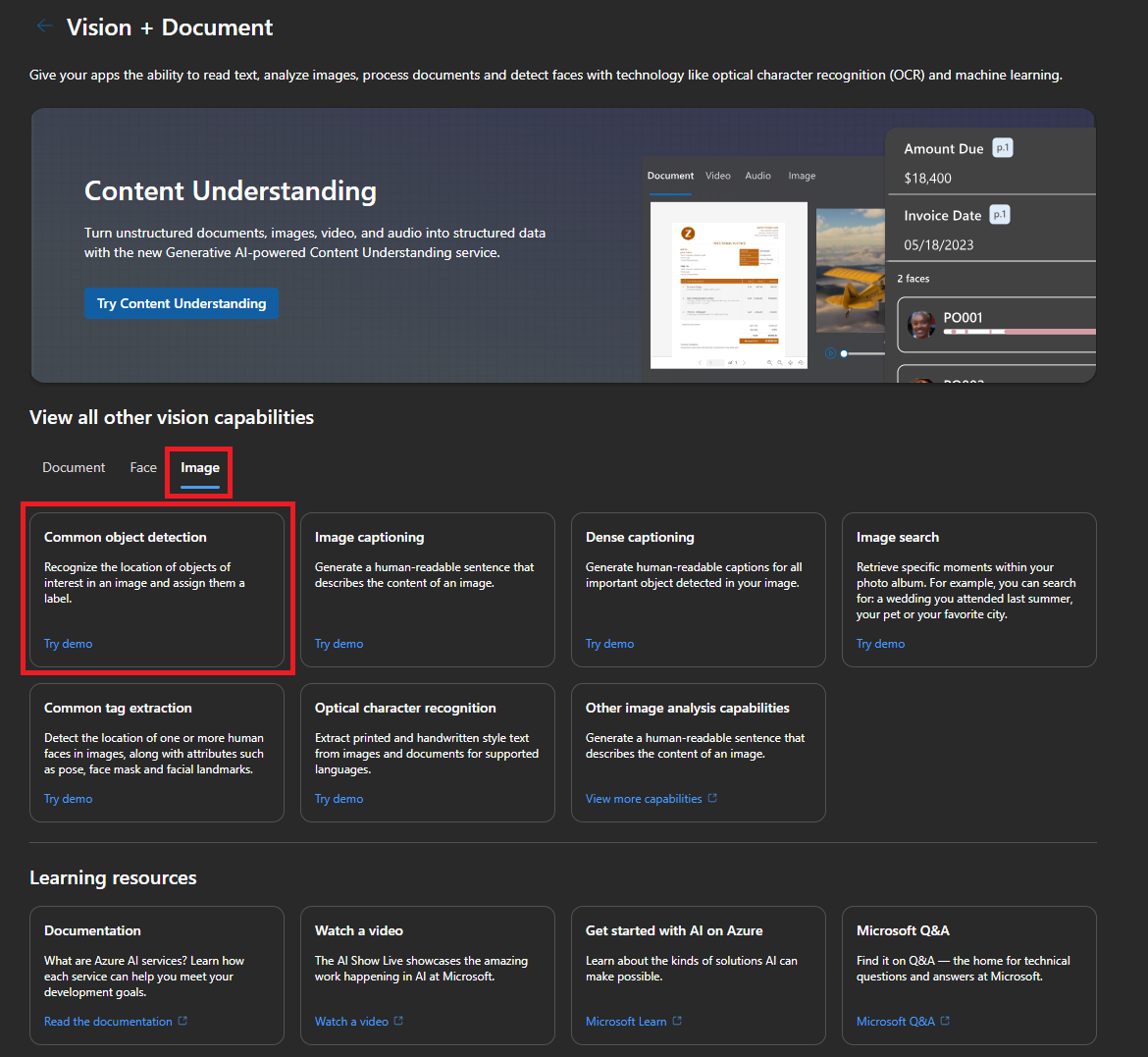 Step 5: This document will proceed with showing the Common object detection as an example of getting started with an AI Service, but these general steps can be followed to select and get started with any AI service. Select Vision + Document, and select “Common object detection” under the Image tab
