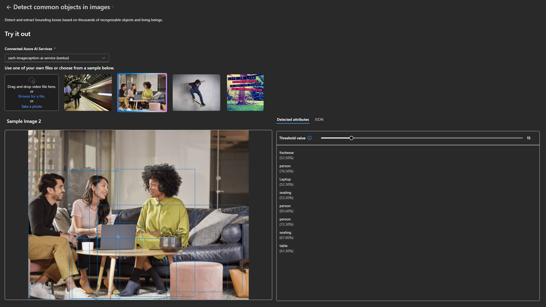 Step 6: Select an Azure AI Service to connect (or create a new one if needed) and upload a file or select a provided example. At this point you should be able to continue trying out different files to test out the selected service