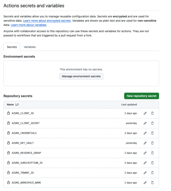 az keyvault secret set --vault-name donkv --name "AZURE-SUBSCRIPTION-ID" --value "baa29726-b3e6-4910-bb9b-b585c655322c"\naz keyvault secret set --vault-name donkv --name "AZURE-RESOURCE-GROUP" --value "don-test-rg"\naz keyvault secret set --vault-name donkv --name "AZURE-WORKSPACE-NAME" --value "don-ml-workspace"