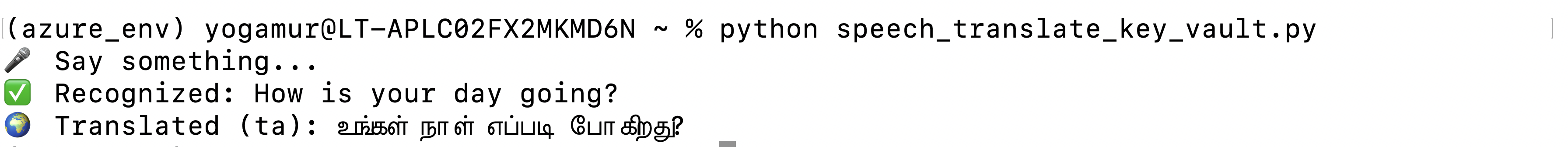 This setup securely connects to Azure Speech-to-Text and Translator services using secrets stored in Azure Key Vault, accessed via `DefaultAzureCredential`.
