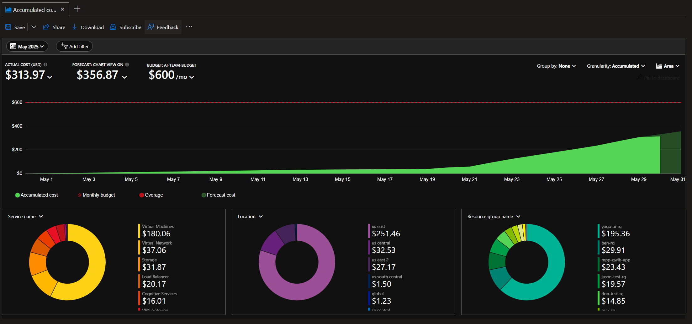 In the Accumulated Costs section, there will be a graph that shows the current month's spend, projected spend, and budget. Below that there will also be charts that break the proportion of spending down by service, location, and resource group. These category of the charts can be changed using the drop down arrow next to their name