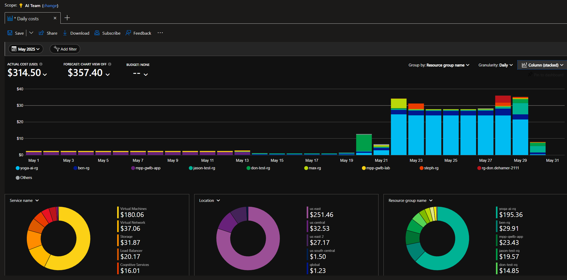 In the Daily costs page, there will be a bar graph showing total spend grouped by resource groups. This can be changed by updated the Group by filter at the top right of the graph, as well as the type of graph that is displayed (column, line, area, etc.). There are also the same charts below the graph that are present below the Accumulated Costs graph