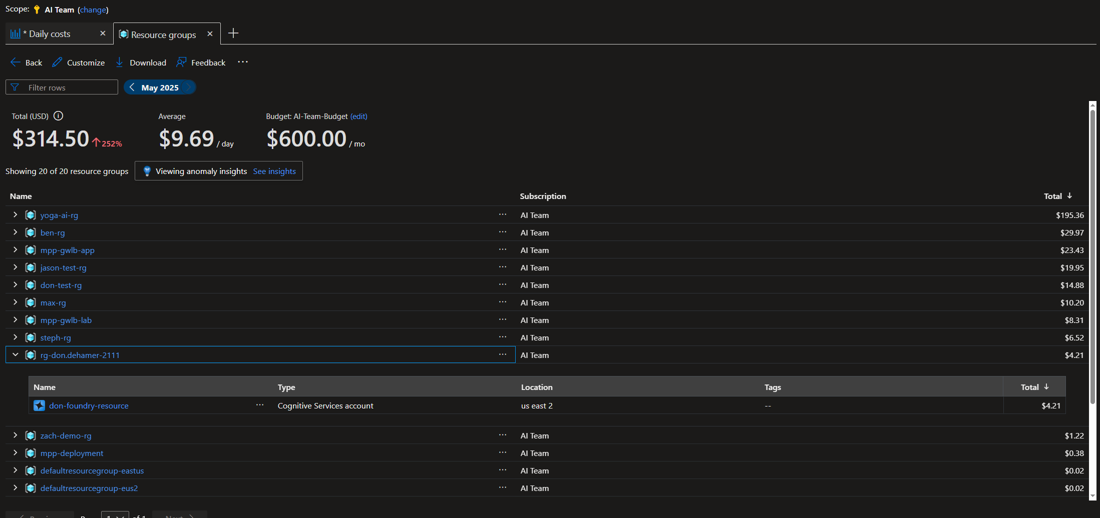 In the Resource groups page, it will display a summary of the total spend, average per day, budget, and the change in spend compared to the prior month. Below the spending summary is a table showing the month's spend broken down by resource group. Each resource group will have a drop down arrow that will show a table breaking down the spend per resource in that resource group
